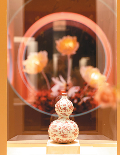 展览注重营造吉祥喜庆、生机勃勃的氛围。一幅展开的《百花图》卷上方,姿态各异的玉蝴蝶在仿真花丛中“翩翩起舞”,令人感觉仿佛走进了姹紫嫣红、蜂飞蝶舞的春日园林。豆青釉蜂蝶图瓜式茶壶、釉里红福寿葫芦瓶、青玉柿子、白玉如意等展品,表达了瓜瓞延绵、福禄双全、事事如意的美好祝愿。“好酒”白釉盘、象牙荸荠、宜兴窑核桃、玛瑙雕枣件等,体现了富足安乐的生活情趣。空间布景与各类寓意吉祥的文物形成呼应,墙上投影着“岁岁长安,皆有所盼”“春日载阳,福履齐长”等吉祥语,大红灯笼与春联相映,洋溢着浓浓的年味。
